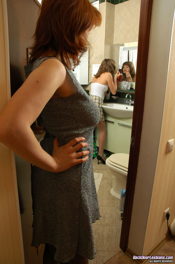 Mischievous gal greeting her lesbian girlfriend with strap-on in her booty